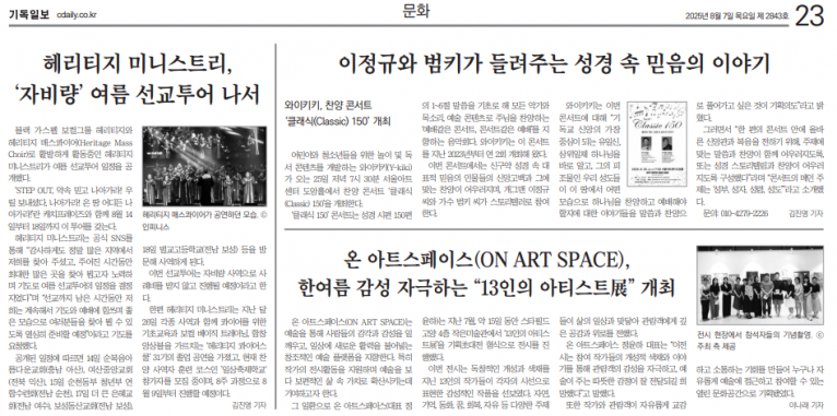 한편 헤리티지 미니스트리는 지난 달 26일 각종 사역과 함께 콰이어를 위한 기초교육과 보컬 베이직 트레이닝, 합창 앙상블을 가르치는 ‘헤리티지 콰이어스쿨’ 31기의 졸업 공연을 가졌고, 현재 찬양 사역자 훈련 코스인 ’일상축제학교‘ 참가자를 모집 중이며, 8주 과정으로 8월 9일부터 진행할 예정이다.