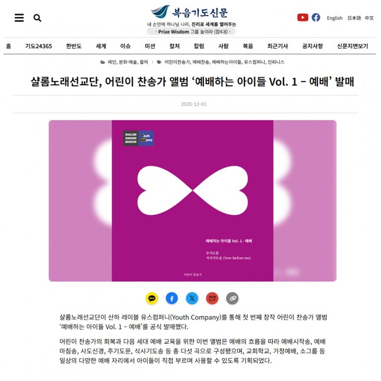 [기사] 샬롬노래선교단, 어린이 찬송가 앨범 ‘예배하는 아이들 Vol. 1 – 예배’ 발매(복음기도신문)