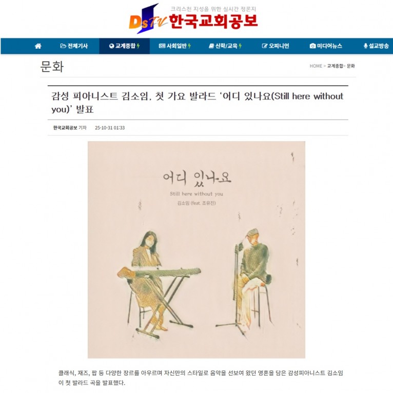 [기사] 감성 피아니스트 김소임, 첫 가요 발라드 ‘어디 있나요(Still here without you)’ 발표(한국교회공보)