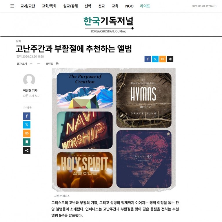 그리스도의 고난과 부활의 기쁨, 그리고 성령의 임재까지 이어지는 영적 여정을 돕는 찬양 앨범들이 소개됐다. 인피니스는 고난주간과 부활절을 맞아 깊은 울림을 전하는 추천 앨범 5선을 발표했다.